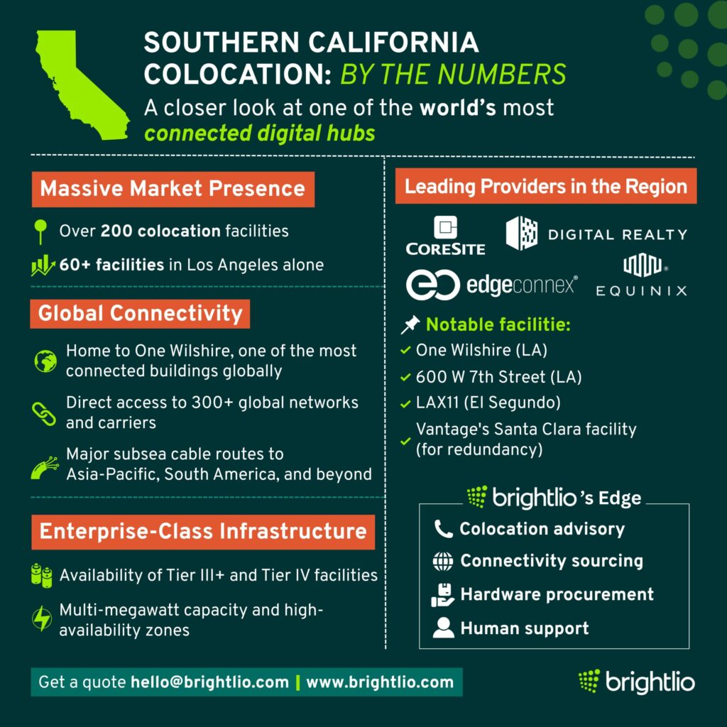 - Major Data Centers: One Wilshire Data Center, Cyxtera, Coresite, Zenlayer, Evocative, Evoque, DataBank.